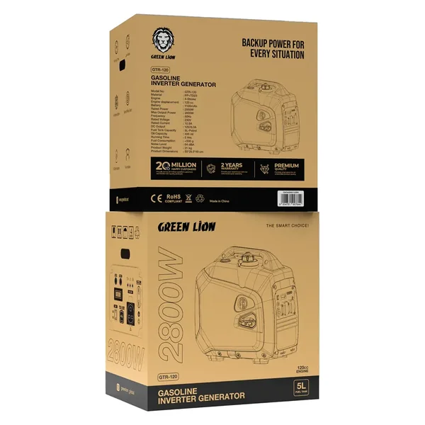 The Green Lion Gasoline Inverter Generator GTR120 ensures a steady and adequate power supply meant for various applications. Powered by a 4-stroke, 120cc displacement engine, it produces a rated power output of 2500W with a frequency of 50Hz. This generator has a petrol fuel tank of 5L capacity to operate continuously for a good 5 hours and an oil capacity of 400mL. Its DC output is 12V/8.3A, which is useful for charging appliances. The noise rating is merely 64 dBA, providing quieter operations best suited for residential and outdoor applications. The ignition of this generator is as simple as a start switch operation, with electric and recoil start choices and a fuel indicator feature. With less than 500g fuel consumption, it is low on energy, hence friendly to the environment. Surely, the GTR120 is a perfect power solution on the go.