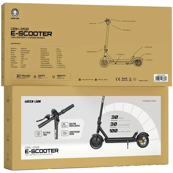 The Green Lion GBK-250 E-Scooter - Black is a model that mixes with the help of sculptural design, powerful, and, most importantly, things for the urban people - convenience. The e-scooter is equipped with a frame made of durable aluminum alloy, and through this, it is able to combine being both lightweight and sturdy, providing a ride that is smooth and stable. A 250W DC motor drives a brushless motor that provides efficient power at a maximum of 30km/h and a 12° incline, which makes it suitable for riding up and down city slopes and doing daily commuting. The electric scooter has a 10Ah Li-ion battery, which allows it to go up to 25–30km on a single charge; the charge takes 6–7 hours. The front electric brake and the rear drum brake give the rider the highest safety, while the 8.5-inch solid tires offer great traction and shock absorption. A 30W headlight will make you more visible, and a real-time digital display will keep you updated. The GBK-250 has three adjustable speed modes, so every ride will be comfortable, controlled, and confident.