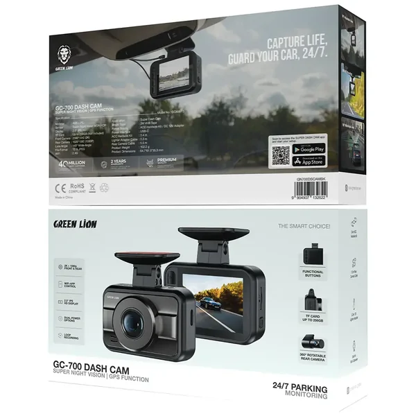 The Green Lion GC-700 Dash Cam with Super Night Vision & GPS Function records high-definition video during both daytime and nighttime to provide you with trustworthy proof that you require at critical moments. The Super Night Vision WDR/HDR system enables the device to display clear video footage of low-light environments during nighttime. The 2K front camera (2560×1440) and 1080P rear camera (1920×1080) deliver sharp, detailed video for both directions. The 145° wide-angle lens captures more of the road, minimizing blind spots. The 2.0" IPS HD display allows easy viewing of recordings. You can store footage with a 256GB TF card (sold separately), and the dash cam supports Wi-Fi app control for remote access. The 360° rotatable rear camera enables a flexible camera setup. The dual power options (ACC hardwire kit or 12V adapter) enable you to perform a simple installation of the cam into your vehicle for continuous monitoring. The Green Lion GC-700 Dash Cam uses loop recording together with G-sensor emergency lock and additional features to protect your safety while driving.