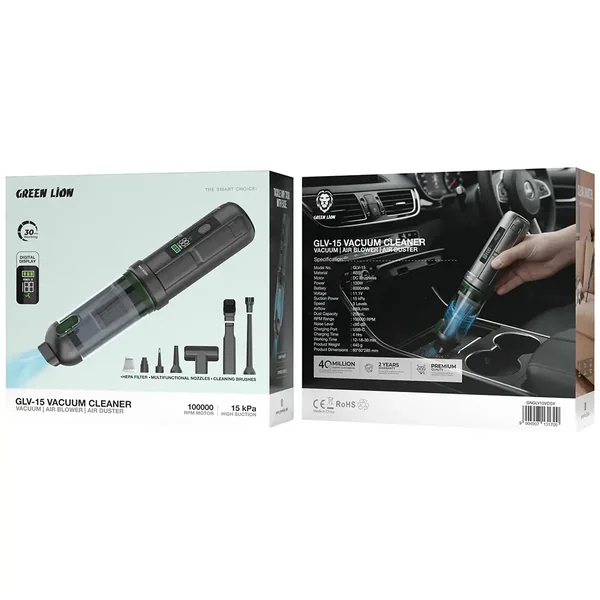 The Green Lion GLV-15 Vacuum Cleaner with Air Blower & Air Duster offers a strong cleaning capacity to handle various home cleaning tasks, car maintenance work, and cleaning electronic devices. The device uses a DC brushless motor, which produces rotational speeds of 100000 RPM to create suction power that reaches 15kPa, enabling users to perform both small cleaning jobs and large cleaning operations. The 6000mAh battery provides an impressive working time of up to 30 minutes, which allows you to clean thoroughly without interruption. The device uses a 200mL dust capacity, which combines with its HEPA filter system to effectively capture dust and particles, leading to better air quality in the environment. The USB-C charging port allows users to recharge their devices, which delivers complete battery power restoration within four hours. The digital display keeps you informed about battery levels while the multifunctional nozzles and cleaning brushes offer flexibility for different surfaces. The vacuum cleaner is lightweight and portable, which makes it essential for various cleaning tasks.