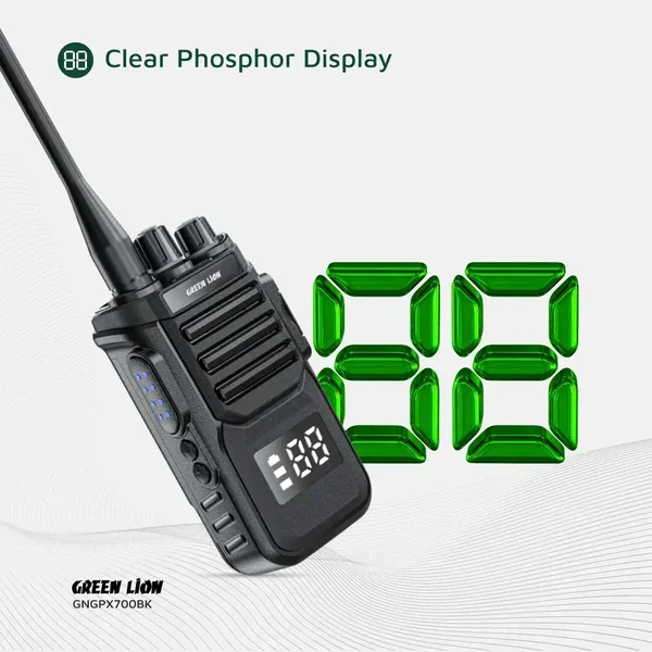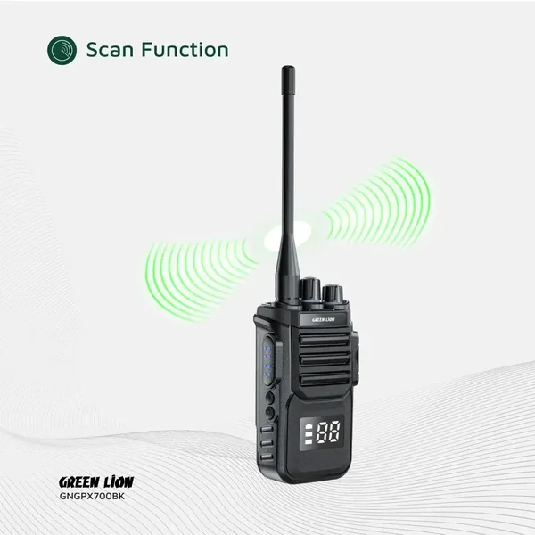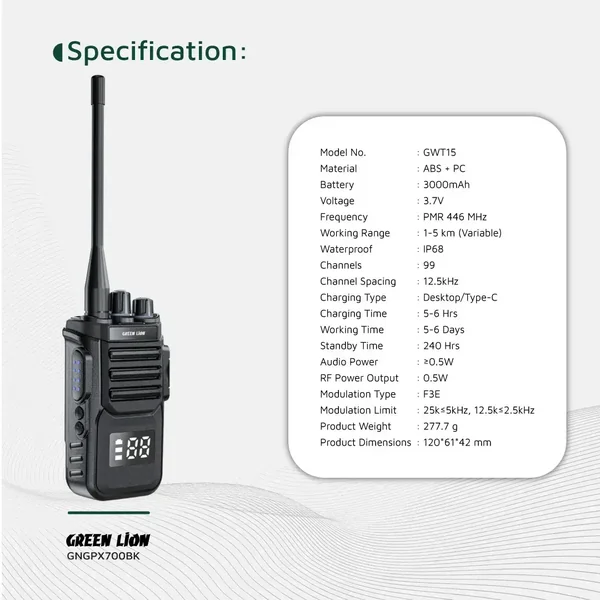 Green Lion GPX700 Walkie Talkie is a durable communication device made of powerful ABS and PC materials for reliable connectivity. Powered by a 3000mAh battery. This product stays 5-6 days of working hours and in stand-by mode 240 hours. Operating on the PMR 446 MHz frequency, it offers a variable working distance of 1-5 km, suitable for diverse situations. It is IP68 waterproof rated and thus ideal for use outdoors. It comes with a clear phosphor screen, volume control dial, high-gain antenna, and scanning capability to enhance usability. Charging is facilitated in 5-6 hours, preparing it for extensive long-term use in the field.