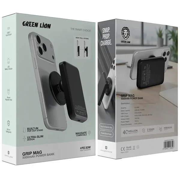 The Green Lion Grip Mag 5000mAh Power Bank combines portability with powerful performance. The 5000mAh battery capacity (19.25Wh) delivers dependable power to charge your devices. The USB-C input/output supports fast charging with 5V/3A, 9V/3A, and 12V/2.25A, which can reach a total output of 30W, while the wireless output provides up to 15W for charging without cables. The secure magnetic hold keeps your devices stable while the MagSafe compatibility provides added convenience. The built-in safeguard protects your devices from overcharging, which ensures their safety during operation. The pop-out stand enables hands-free phone use by supporting your device in an upright position. The ultra-slim design enables simple carrying because it fits perfectly into your pocket. The LED battery indicator shows you the current charge status, which helps you stay ready at all times. The Green Lion Grip Mag Power Bank serves as the most efficient solution for portable charging needs.