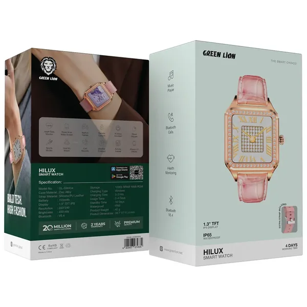 The Green Lion Hilux Smart Watch with Extra Strap is a trendy and practical gadget that would definitely upgrade the tech aspect of your daily life. The 1.3" TFT IPS monitor, which absolutely has a 450 nits brightness and a clear quality of 240x240, shows amazing and sharp visuals even under the brightest light conditions. The watch uses a breathable silicone or PU leather strap that is comfortable for all-day wear. As a plus, it also has a durable zinc alloy casing. This smartwatch is loaded with high-tech features. It offers a heart rate monitor, a pedometer, sports modes, and blood oxygen level measurement, among them. It also has a voice assistant for hands-free operation, a remote shutter, and built-in games for entertainment. The watch can be relied on for long hours of use, given its 4 days of use and 10 days of standby time. The Green Lion Hilux Smart Watch can adapt to any condition. It is a perfect companion during exercise and in inclement weather. It has an IP65 water resistance rating. The extra strap provided enhances the versatility of the wearable device.