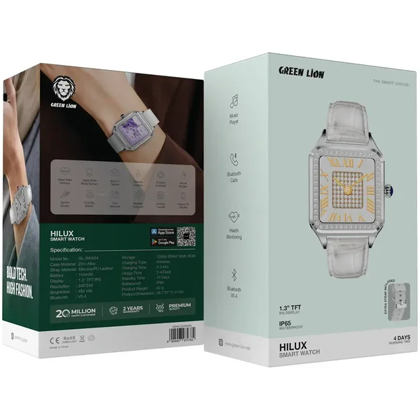The Green Lion Hilux Smart Watch with Extra Strap is a trendy and practical gadget that would definitely upgrade the tech aspect of your daily life. The 1.3" TFT IPS monitor, which absolutely has a 450 nits brightness and a clear quality of 240x240, shows amazing and sharp visuals even under the brightest light conditions. The watch uses a breathable silicone or PU leather strap that is comfortable for all-day wear. As a plus, it also has a durable zinc alloy casing. This smartwatch is loaded with high-tech features. It offers a heart rate monitor, a pedometer, sports modes, and blood oxygen level measurement, among them. It also has a voice assistant for hands-free operation, a remote shutter, and built-in games for entertainment. The watch can be relied on for long hours of use, given its 4 days of use and 10 days of standby time. The Green Lion Hilux Smart Watch can adapt to any condition. It is a perfect companion during exercise and in inclement weather. It has an IP65 water resistance rating. The extra strap provided enhances the versatility of the wearable device.