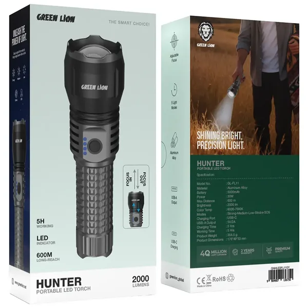 The Green Lion Hunter Portable LED Torch provides users with a dependable illumination solution that they can use during their outdoor activities. The torch body, constructed from strong aluminum alloy material, enables users to experience both solid durability and easy-to-carry weight. The system operates through a 5000mAh battery, which provides 30W power output and produces 2000 lumens of brightness while reaching an ultimate beam distance of 600 meters. The torch provides five different light modes, which include strong, medium, low, strobe, and SOS to provide you with multiple options for different circumstances. The system enables users to control their lighting needs through adjustable focus, which provides both broad flood and narrow beam lighting options. The Green Lion Hunter provides users with efficient power management through its USB-C charging system, which includes a second USB-A port for charging different devices. The LED indicator keeps you informed of the battery status. The torch provides 5 hours of operating time, which makes it suitable for outdoor activities, emergency situations, and regular use during times of low visibility.