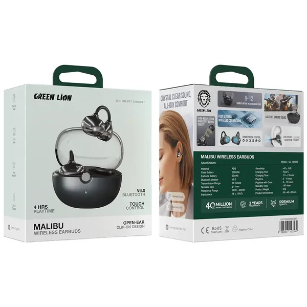 The Green Lion Malibu Wireless Earbuds provide users with deep sound quality while offering a comfortable ear fit. The earbuds deliver 4 hours of playback, which allows users to hear sound through their 11mm drivers and Bluetooth V6.0 technology that transmits audio wirelessly. The open-ear clip-on design provides users with complete day comfort because it delivers a secure fit that stops ear fatigue. The touch control feature enables users to control music playback volume adjustments and call answering through simple tapping. The earbuds achieve fast charging through USB-C charging, while their 180 hours of standby time enable users to maintain constant readiness. The IPX4 waterproof rating allows users to wear the headphones during any activity, including traveling and exercising. The Green Lion Malibu Wireless Earbuds establish themselves as an essential accessory for people who need to stay productive throughout their day because they support voice assistants and provide straightforward control options.