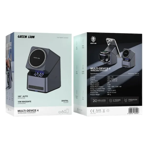 The Green Lion Multi Device 4 Wireless Charger combines functionality and minimalist style into one. It comes with particular outputs: 5W for AirPods, 2.5W for iWatch, and a maximum of 15W for cellular phones, meeting various charging needs. It has an energy conversion efficiency of ≥70% and can work fully at -10°C to 50°C.It has touch controls, a convenient adjustable angle view for positioning, and a Type-C interface. It is lightweight and portable and is best used at home, in the office, or during travel, providing quick and reliable wireless charging for all of your needed devices.
