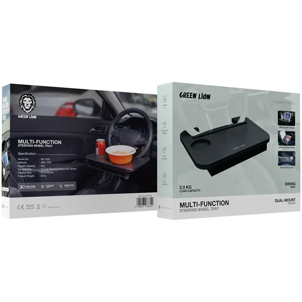 If you are looking for a product that would help you greatly on your driving trips, then the Green Lion Multi-Function Steering Wheel Tray in Black would be the best option. This tray, designed for easy transfer from one circular steering wheel (35-42mm) to another, is made of tough materials, ABS and TPR. With its dual-mount design, it is very stable and can be used securely for different activities. The multifunctional tray is a holder for a tablet and cup, a workstation for a laptop, a dining tray, and it also comes with a gap storage box for better organization. Its capacity of 2.0kg makes it very safe to use because it is not only up to the weight of your devices and items but also done with no hindrance to safety. The installation is quite simple and fast, whereas the cleaning of the surface is so easy that it can be considered a maintenance-free product. In short, the Green Lion Steering Wheel Tray is a practical and efficient solution to all your car trips, whether it is for working, eating, or storing small items.