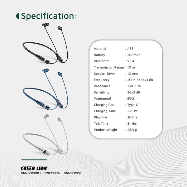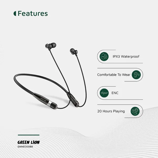The Green Lion Neck X Wireless Neckband is a perfect blend of technology and comfort for an unmatched audio experience. It has a 10mm driver and 20Hz-5KHz frequency, so it gives clear, sharp sound along with deep bass. The newest Bluetooth V5.4 ensures a strong connection with a transmission of 10 meters, and the dual-mic ENC ensures clear calls. With its ultra-lightweight ABS material design and IPX3 water-resistance standard, the neckband is perfect for use in active life. The neckband offers a maximum talk time of 21 hours and 20 hours of playtime with a battery of 200mAh, which gets fully charged within 1.2 hours via Type-C charging port. Ergonomic fit guarantees long listening hours and 96±3 dB sensitivity ensures an unforgettable listening experience. Whether it's for work or leisure, the Green Lion Neck X is a convenient friend to have during the day.