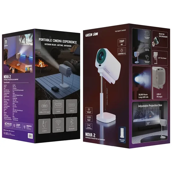 The Green Lion Nova2 Portable Projector brings the movie theater experience to your home, providing 4K support for a superior visual experience. The adjustable projection screen provides you with the ability to create different image sizes between 50 inches and 100 inches, which enables you to find your ideal projection solution. The projector delivers explicit images through its 150 ANSI lumens brightness capacity, which operates effectively in well-lit spaces. The system enables users to access all applications because it runs on Android 13, which enhances their streaming, gaming, and presentation abilities. The viewing angle adjustment process becomes simple through the 360° tilt and stand system, which enables users to project content wirelessly from their devices through wireless mirroring technology. The system includes a built-in 3W speaker for audio output, and users can connect various devices through its multiple ports, which include USB-C, HDMI, and 3.5mm audio connectors. The Green Lion Nova2 functions as a portable entertainment and work solution because it combines multiple functions with easy operation.