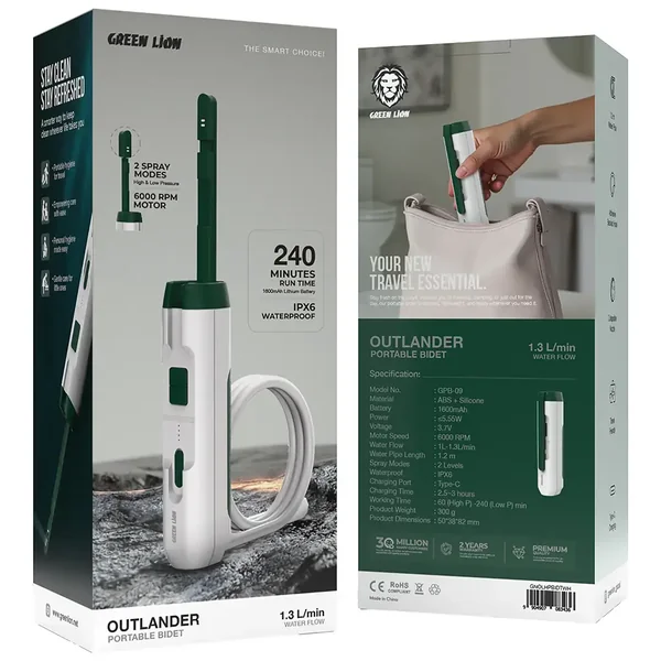 The White version of the Green Lion Outlander Portable Bidet is the best to keep you clean and makes the whole process more convenient and fuss-free. It is made of durable ABS plastic and silicone, featuring a 1600mAh battery that can last 240 minutes on the lowest setting, plus a quick 2.5-3 hour charging time via USB Type-C. The device operates in two different spray patterns and can also create varying water pressure levels during the process, thus providing a personalized experience for users along with a flow rate of 1.3L/min for complete cleansing. A 1.2-meter water tube gives the user freedom and convenience of movement, and the foldable nozzle with adhesive-backed hook provides easy storage and transport. The bidet is rated IPX6 for waterproofing and can therefore be used without any worries, even in wet conditions. The Green Lion Outlander Portable Bidet is a pleasant and reliable means of personal hygiene that you can count on wherever you are, either at home or on the road.