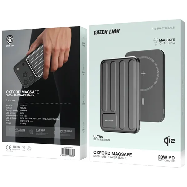 The Green Lion Oxford MagSafe 5000mAh Power Bank is a smart solution for charging your devices really fast and with the least effort, thanks to the new features added, which include MagSafe compatibility and 20W PD (Power Delivery) fast charging as well. Its 5000mAh capacity makes it ideal for charging your devices when you are out and ensures they will be powered even if you are using them throughout the day. Besides, the ultra-slim design makes it so easy to carry and store in your bag or pocket. The Qi2 compatibility gives an unnoticed wireless charging experience. Besides, this little one can wirelessly charge your gadget with a power of 15W, and its USB-C port can give you fast and versatile charging for a great variety of devices. The Oxford MagSafe Power Bank will always be there for you, whether you choose to charge wirelessly or with a cable, providing you with a safe and fast solution to your charging problems. It is ideal for those who want to stay connected to the world and have a power supply but do not want to compromise on performance or aesthetics.