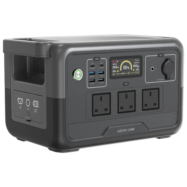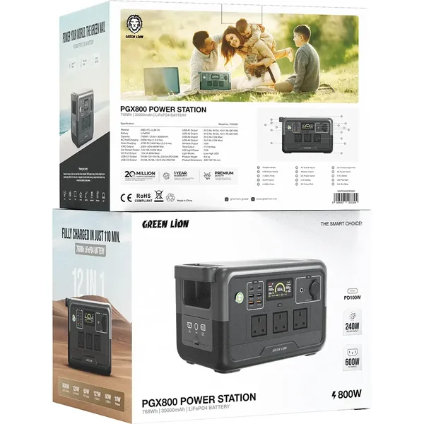 The Green Lion PGX800 Power Station - 768Wh, 30000mAh LiFePO4 Battery is an extremely dependable power source that is also portable. Strong ABS + PC UL94 V0 material is being used for its construction, thus it assures the ultimate strength and safety. The LiFePO4 battery capacity of 768Wh (30000mAh) is really great for camping, traveling by road, or even supplying power in case of emergency. PGX800 can be charged via AC wall charging of 600W (1.5–2 hours) or through solar charging of 240W (3.5–5 hours); thus, it provides different methods of recharging. The total number of outputs is at least 8—3 AC ports (800W Max), USB-C (PD100W), USB-A (QC18W), DC, and a 10W wireless charger—all of which are capable of simultaneously powering various devices: besides laptops and phones, also mini appliances. The large LCD display not only shows the power in use but also the multi-layer protection system guarantees safety during the operation. Additionally, its 3-mode LED light (Low, High, SOS) is very helpful in outdoor and emergency situations.