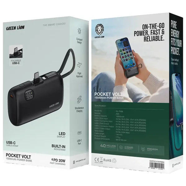 The Green Lion Pocket Volt 10000mAh Power Bank provides an ideal solution for users who need a compact power source that delivers exceptional performance. The power bank features a portable design that enables easy transportation and includes a kickstand that allows users to watch content hands-free during charging. The power bank's 10000mAh capacity enables users to charge their devices multiple times, which keeps them connected while traveling. The PD 20W USB-C ports and connectors provide efficient fast charging capabilities, which support various devices, including smartphones and tablets. The device supports multiple device charging because it enables users to charge several devices simultaneously. The LED display shows current status information while the foldable USB-C connector and included cable strap enable users to store and organize their devices easily. This power bank has received approval for air travel, which makes it suitable for travelers who need a dependable portable charging device that can fit into their bags or pockets. Keep your devices charged and ready for anything.