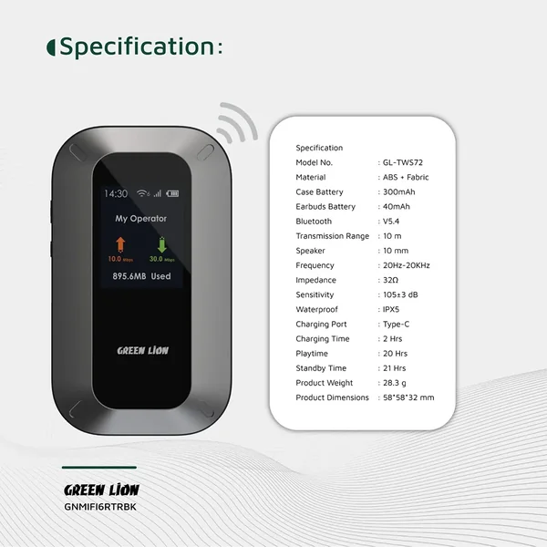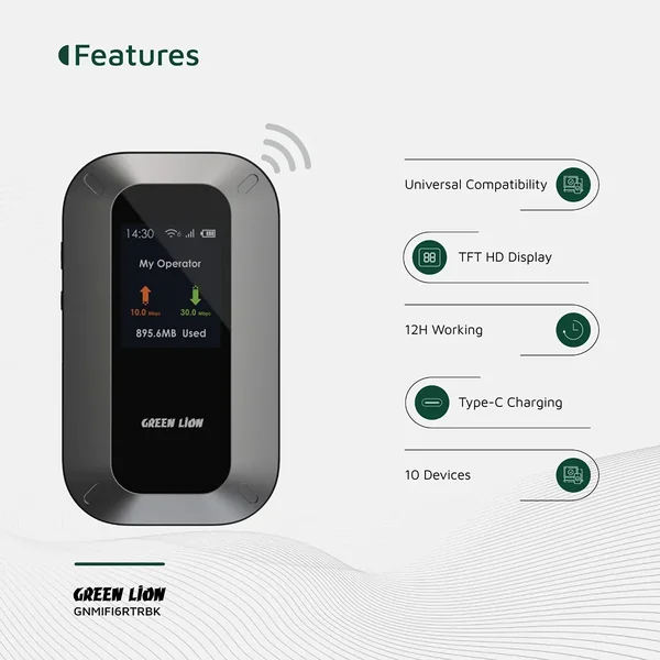 The Green Lion Portable MiFi Router: Black is a compact and effective device that provides unbridled internet access anywhere. Crafted with durable PC and ABS materials, it has a 3000mAh battery that provides 10 to 12 hours of use time. With a Cortex-A7 CPU and Linux OS, it can utilize WiFi 6 technology to provide fast and stable wireless functionality. Compatible with various bands , including LTE, HSPA, EDGE, and GSM, it supports download speeds of up to 150Mbps  and upload speeds of up to 50Mbps .It can support a maximum of 10 devices at once via WiFi or USB. It can do secure encryption and automatic installation for easy and secure use. It has a Type-C port for fast charging, and it takes 2.5 hours to charge, which is appropriate for on-the-go usage.