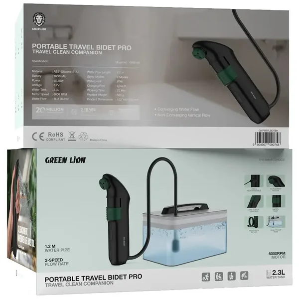 The Portable Bidet Pro also comes with a 3.7V, 1600mAh battery meaning you will get approximately 70 minutes of use on a single charge, and a 2.3L tank with free-flowing water at a flow of 1L to 1.3L/minute using a motor running at 6000 rpm in order to keep up with your desired use. There are two spray modes on this portable bidet (which adds flexibility), plus a nozzle position option that will let you adjust yourself. The 1.2-meter water pipe increases the range of maneuverability and comes with an IPX6 waterproof rating. The Type-C charging port is also the fastest charging option and the range of two speed flow rates is very good to have when you need to adjust your flow while travelling. This portable bidet represents a dependable, portable, travel, and hygiene outdoors tool, camping tool, and daily hygiene exigency tool.