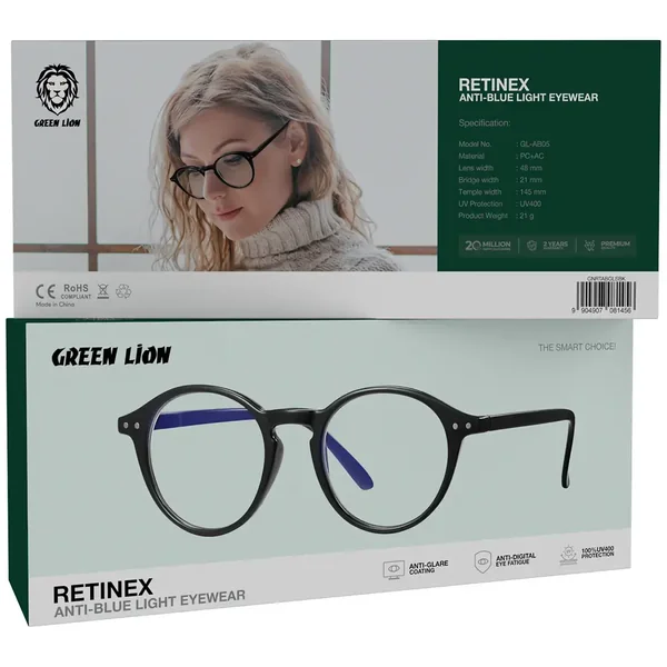 The Green Lion Retinex Anti-Blue Light Eyewear - Black is a product that not only protects the eyes but also gives an exceptional and classy look and comfort during long hours of screen time. The quality of construction is such that these glasses are made of high-quality PC + AC materials, reflecting that they are very light on the face and at the same time very durable. Wear them all day long with no discomfort at all. The lens size of 48mm, the bridge size of 21mm, and the temple size of 145mm give a proportional fit that is apt for most face types. Moreover, they come with complete UV400 filtering, which also has the effect of glare reduction for the digital screens, besides being an anti-glare coating. The blue-light filtering system that the Retinex glasses are equipped with helps in reducing the digital eye strain that occurs due to the use of computers, smartphones, and other light-emitting devices. Such a technology leads to healthier vision during prolonged usage. The office and indoors are the perfect places for the use of these glasses, and they will, at the same time, provide you with comfort at night and help you relax by reducing visual fatigue. The Green Lion Retinex eyewear, with its elegant black design and the latest protective features, is a combination of style, comfort, and state-of-the-art eye protection, which is a must-have accessory in today's world.