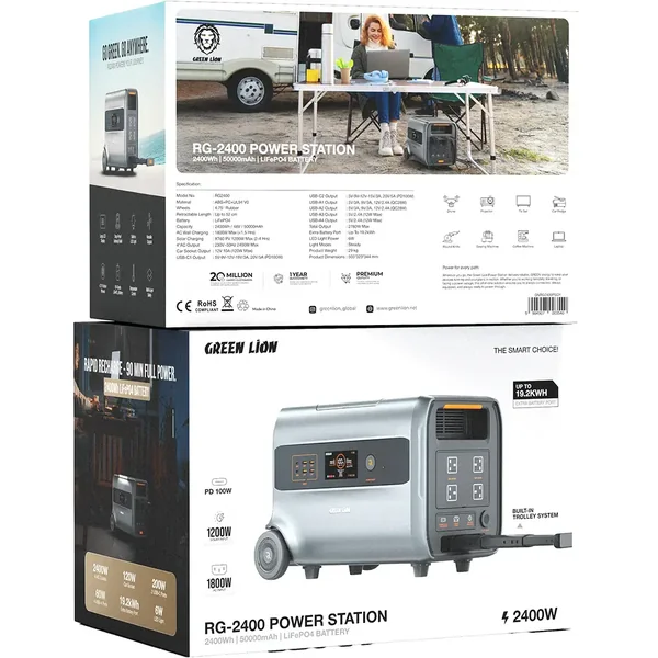 The Green Lion RG-2400 Power Station - 2400Wh 50000mAh (LiFePO4) - Gray is the top pick for reliable high-capacity mobile power. The durable LiFePO4 battery allows a capacity of 2400Wh, which makes the essential devices' performance last until the very end of the day. Its ABS+PC UL94 V0 unibody construction, which is hypoallergenic and fire-resistant, provides not only safety but also strength. Additionally, the 4.75" rubber wheels and the retractable handle make it extremely convenient for movement around. The device is equipped with 4 AC outlets that can power a maximum of 2400W, dual USB-C PD100W ports, and several USB-A outputs, making it possible to charge a number of devices simultaneously. The battery port allows for a power expansion of up to 19.2kWh, so one can run even the most demanding appliances for a longer time. Fast solar (1200W) and AC charging (1800W) are the ways through which the RG-2400 is able to give out power and flexibility anywhere. The unit incorporates temperature control, multi-layer safety protection, and a large LCD display, which altogether contribute to the comfort and usability. Over and above this, the Green Lion PGX1200 is an excellent, powerful, and eco-friendly power source that meets all your energy requirements while traveling, thanks to its multi-layer safety protection and smart power management systems.