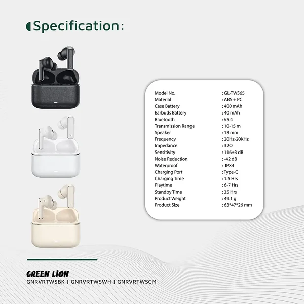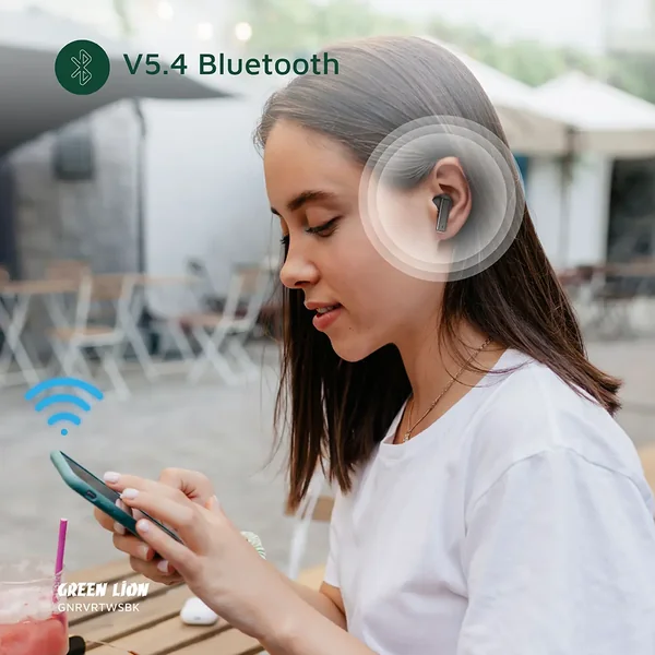 Green Lion River True Wireless Earbuds provide quality sound and comfort. Made of ABS + PC material, it has a light but long-lasting everyday wear structure. With a 13mm speaker size, it gives deep sound, a frequency of 20Hz-20kHz, and a 32Ω impedance that ensures crystal clear and dynamic sound. The sensitivity of 116±3dB provides depth to your music. With Bluetooth V5.4, these earbuds offer a stable connection within a 10-15m transmission range. Enjoy 6-7 hours of playtime and up to 35 hours standby with the 400mAh case battery and 40mAh earbuds battery. Fast and convenient Type-C charging offers quick recharges in 1.5 hours. Wireless charging is also available for added convenience. Equipped with ANC and ENC clarity technology and noise cancellation of -42dB, you've crystal-clear sound even in the noisiest environments. IPX4 waterproofing protection makes them perfect for outdoor use, and smart in-ear detection delivers peak battery efficiency.