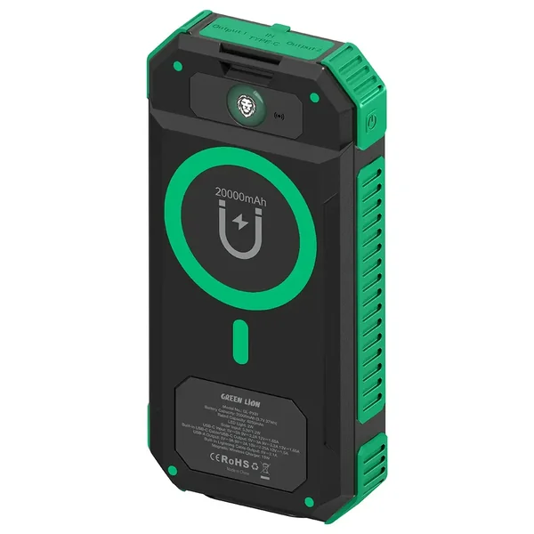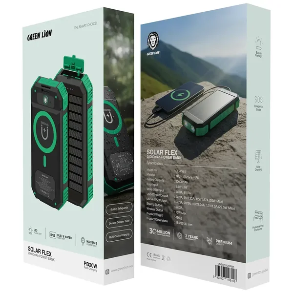 The Power Bank Green Lion Solar Flex 20000mAh in green and black is the ultimate choice of portable charger when it comes to outdoor adventures and emergencies. With a gigantic 20000 mAh battery capacity, it is capable of continuously powering several devices at the same time, like smartphones, tablets, and more. This power bank is perfect for hiking and camping trips, since aside from solar charging, it can also use the energy of the sun to recharge when you are not near an outlet. The combination of USB-C and USB-A outputs offers a very fast charging of up to 22.5W, with the wireless output giving up to 15W for compatible devices. Moreover, this power bank integrates a flashlight and an emergency strobe for signaling or lighting that can be used in the dark. The gadget allows for IP65 dust and water resistance, MagSafe compatibility, and built-in protection, thus it can endure extreme conditions. It is a miraculous gift for all who travel since it is rugged, portable, and gives you the assurance that it will not run out of power. Solar Flex is your great companion because it provides you with the confidence and the luxury of being charged no matter the place.