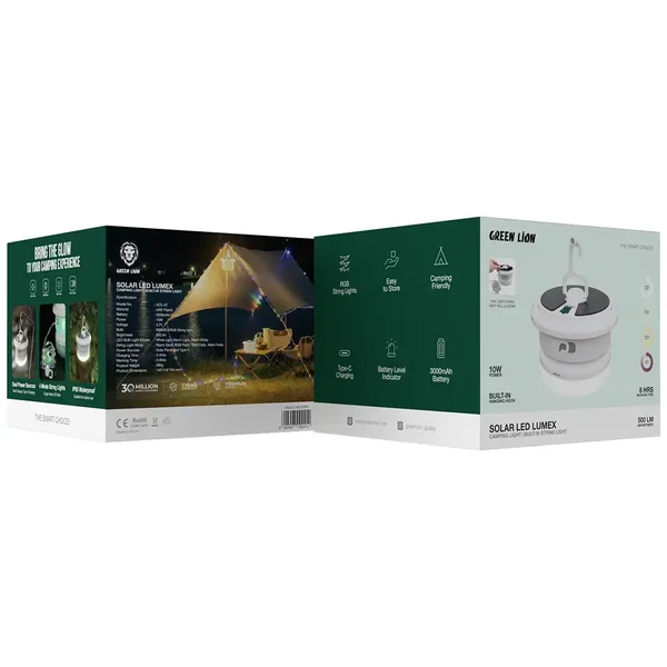 The Green Lion Solar LED Lumex Camping Light & Built-In String Light - White is an unbeatable solar-powered LED light that can be used not just in outdoor adventures but also in indoor and even nighttime activities. Solar-powered, it can also be used as a combo of the two LED lighting functions, making it a multipurpose item for different environments, still powered by the rechargeable battery that lasts long. The light hook for suspension is included, so it can be used for any outdoor activity like camping, hiking, or just lighting up the backyard, and so on. Its weather-resistant design also means that it will last for many years, even if it is used regularly in rough outdoor conditions, making it a good choice for outdoor life. The energy-efficient light, which requires a solar power source for charging, is consequently an eco-friendly alternative to the traditional battery-operated lights. The Green Lion Solar LED Lumex Light is the right partner for all your outdoor adventures, as it can serve as a light source during camping or as an emergency light. Its small and solid design is the point that attests to it being a requirement for the outdoor lovers.