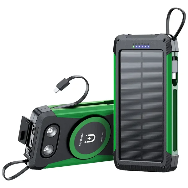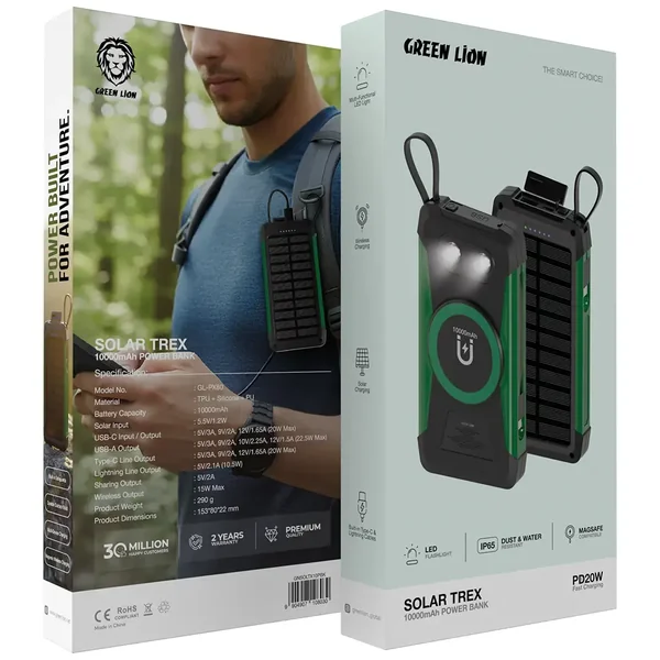The Green Lion Solar Trex 10000mAh Power Bank is a rugged, powerful product that makes a perfect power solution for your outdoor adventures. Moreover, it features solar charging, allowing you to recharge the power bank in sunlight, making it suitable for outdoor activities. Besides that, it has dual charging ports, including USB-C and USB-A outputs for charging two devices simultaneously. The 15W wireless charging feature offers a fast and hassle-free way of charging, and the LED flashlight is handy in the dark. Thanks to the IP65 water and dust resistance rating, the power bank is going to be your hiking, camping, and traveling buddy. This 10000mAh capacity power bank is therefore dependable for long trips. Its compact build makes it easy to slip into your bag, thus guaranteeing the availability of power wherever you are. The Green Lion Solar Trex is the reliable partner you need for every adventure.
