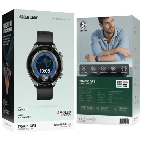 The Green Lion Track GPS Smart Watch combines the best of modern features with simplicity of design. It is made with zinc alloy, with a 1.6-inch AMOLED display of 480×480 resolution and 1000 nits brightness for optimum visibility. It uses a 450mAh battery to provide up to 3-5 days of active working time and 15 days on standby. Bluetooth V5.3 enables BT calling, local music playback, and transporting health metrics. There are also AI watch faces, TWS functions, a voice assistant, and +170 sports modes. With a 5ATM waterproof rating, it is secure for water activities. The useful features include GPS support, geomagnetic and altitude tracking, compass, barometer, and auto-tracking of outdoor adventures. The magnetic charging system also provides fast charging, less than three hours for a full charge. Heavy RAM and a 1Gb ROM make the Green Lion Track Smart Watch an excellent companion for an active lifestyle.