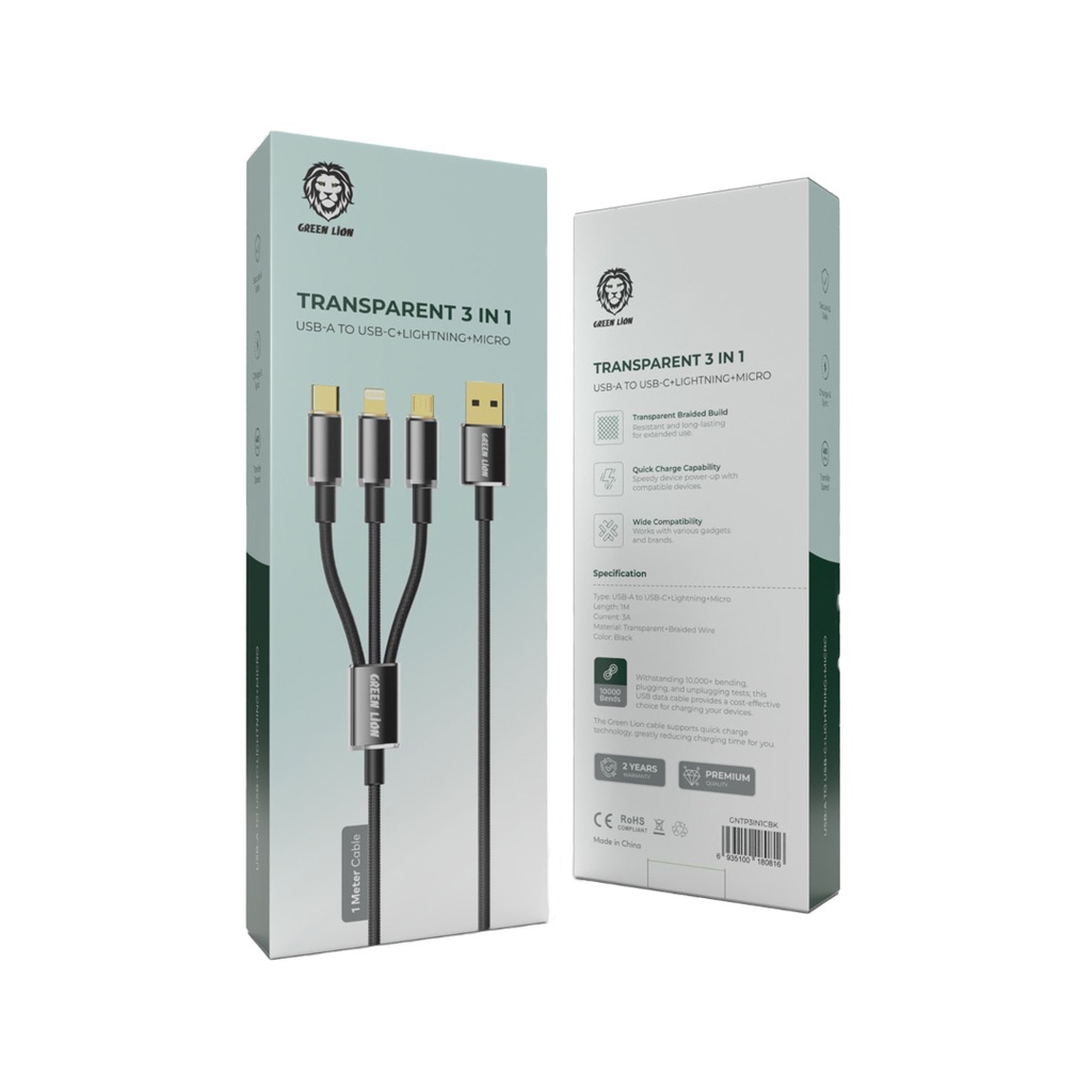 Green Lion Transparent 3 in 1 Braided Cable ( USB-C / Lightning / Micro ) 1M - Black