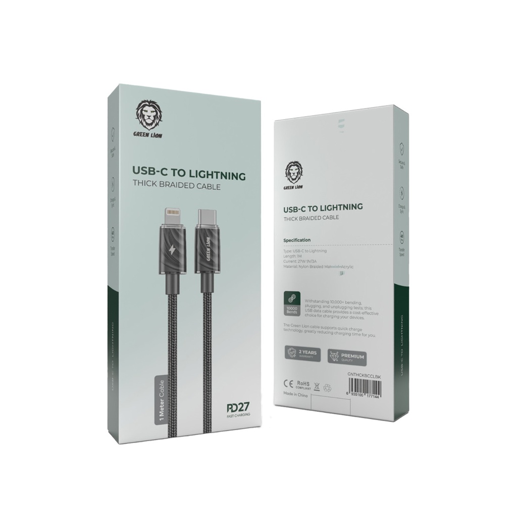 Green Lion USB-C to Lightning Thick Braided Cable 1M PD 27W - Black