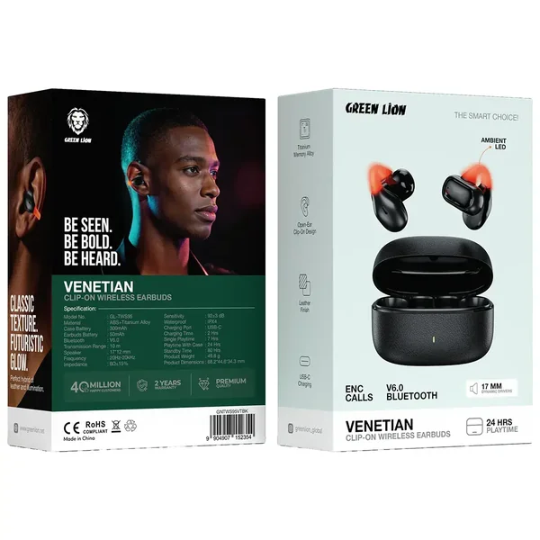 The Green Lion Venetian Clip-On Wireless Earbuds - Black provide superior sound and comfort through their titanium memory alloy design and leather exterior. The earbuds produce precise sound through their 17mm dynamic drivers, which operate at 92 ± 3 dB sensitivity and 20Hz-20kHz frequency range. The open-ear clip-on design provides users with a comfortable and secure fit, which remains comfortable during long periods of use, while the IPX4 waterproof rating allows users to wear the product during exercise and wet weather conditions. The Bluetooth V6.0 technology provides users with a fast wireless connection that maintains stability over a 10m transmission distance. The 300mAh charging case and 50mAh earbud battery enable users to enjoy 7 hours of continuous music playback and 24 hours of listening time. The earbuds feature USB-C charging, which enables users to achieve full power within a 2-hour period. The wireless earbuds combine ENC calling functions with ambient LED lights to create a stylish product that provides both functional performance and attractive design.