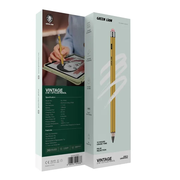 Green Lion Digital Stylus Pencil is precise and durable use, constructed with rugged PC and POM materials. It features a slim 1.7 mm nib, delivering low noise and silky writing. Compatible with iPads 2018 and later (12.2" and up), it provides premium tilt sensitivity for natural drawing and writing. The stylus is equipped with a 130mAh battery with up to 15 hours of use time and a quick 18-minute Type-C fast charge. It also includes auto power-off after 10 minutes of inactivity to save battery and has 6 months' standby time. Real-time OLED screen displays battery status, while the quick and responsive response includes no offset or lag. Auto sleep mode saves battery life, making it ideal for creative and professional use.