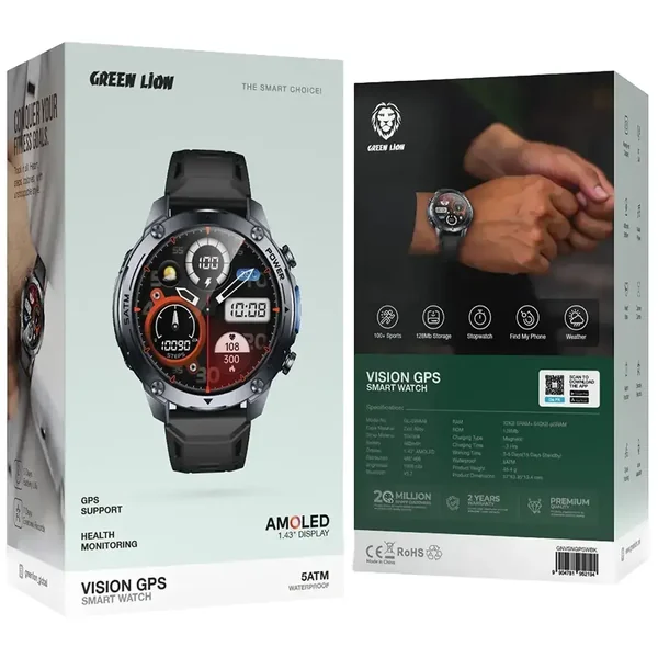 The Green Lion Vision GPS Smart Watch effectively integrates style, functionality, and features for keeping you connected and on the right track. The speaker is made of a zinc-alloy casing and straps that are made of silicone for comfort. This smartwatch flaunts a beautiful 1.43" AMOLED display with a resolution of 466×466, with brightness rated at 1,000 nits for utmost brightness. The unit is powered by a 480mAh battery, capable of sustaining working time between 3 and 5 days and an impressive 15 days on standby time. Bluetooth 5.2 class is used for stable pairing, and for the magnetic charging method that adds convenience with a full charge in less than 3 hours. 32KB SRAM, 640KB pSRAM, and 128MB ROM are packed for the memory, ensuring smooth performance. Waterproof up to 5 ATM, it is great for many activities. BT call, music player, heart rate monitoring, GPS support, voice assistant, and 100+ sports modes are all part of the package. The Green Lion Vision Smart Watch is a true partner down the road towards a healthy and active lifestyle.