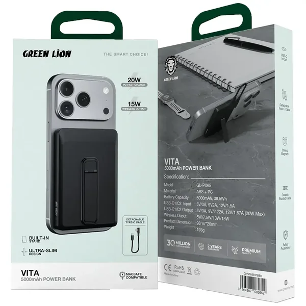 The Green Lion Vita Power Bank - Black is a great combo of a powerful device and a modern-looking power bank. The future is here with its 20W PD fast charge and 15W wireless output that make it a super-efficient charger for your devices. The 10000mAh and 5000mAh battery capacities guarantee that your phone and gadgets will last the whole day. One of the features of this power bank is a Type-C cable that can be detached, so you will never have an issue with charging because of a wrong cable. Its very slim design makes it portable indeed - you can carry it wherever you go. The built-in stand allows you to keep your device in an upright position during charging, which is a nice addition. With MagSafe compatibility, a strong magnetic link with the device is assured. The durable rack-and-pinion cable is a guarantee of long life and service of the power bank, plus the safety features give you a worry-free time while using the device. The Green Lion Vita Power Bank is an excellent product that combines power, design, and functionality for anyone needing a dependable charging option.