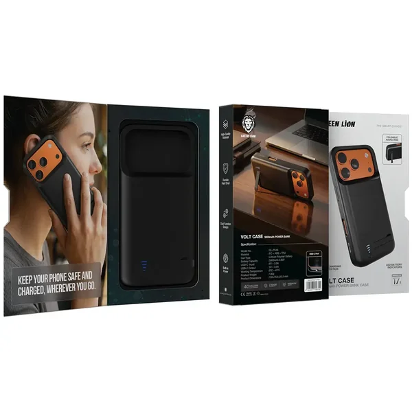 The Green Lion Volt Case Power Bank Case For iPhone 17 Pro/Pro Max - Black provides a portable case that enables both phone charging and protection. The product functions as a dual-purpose device that enables simultaneous phone charging and phone protection. The LED battery indicators let you easily check the power level, while the foldable kickstand provides added convenience, which lets you operate your phone without using your hands. The TSA-approved power bank maintains your phone's power during road trips and errands, with its 120mAh battery and 30W PD fast charging capability. The device provides 40 minutes of use before requiring a recharge, and users can charge their devices through the USB-C charging port, which enables fast and simple charging. The Green Lion Volt Case provides a portable power solution that enables users to protect their phone while maintaining readiness for upcoming journeys.