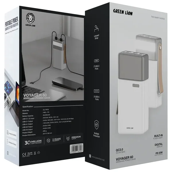 The Green Lion Voyager 60 Power Bank 60000mAh stands out as an eco-friendly and handy alternative when it comes to battery consumption and other related issues. One of the most remarkable features of the power bank is a USB-A port that makes each battery a cakewalk to recharge, with no need for a separate charger. Moreover, the indicator light provides easy-to-read charging status; it rotates green while charging and remains solid when completely charged. These batteries have a 10000 recharge cycle lifetime, and they are very durable, so that the disposable ones are fewer in number. Their compactness makes them easy to store and use in everyday devices, which are perfect for. The USB-A rechargeable batteries are simply giving out power with less environmental impact and thus are used in remote controls, toys, or any other battery-operated gadgets. A short charge and a wide temperature range are among their features that make them perfect for home as well as for on-the-go usage.