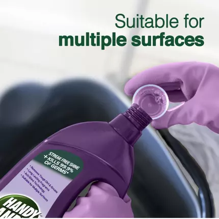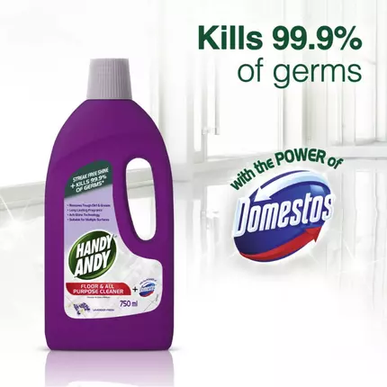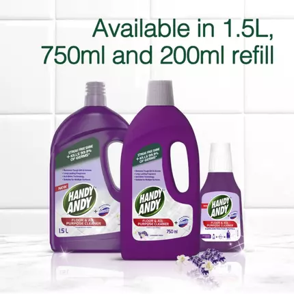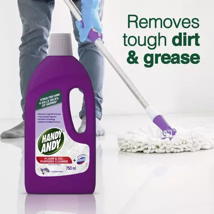 Handy Andy Lavender Fresh Floor and Multipurpose Cleaner gives your floors an impeccable shine and leaves them 99.9% germ free. Formulated with the disinfectant power of Domestos, this floor and multipurpose cleaner easily cuts though stubborn dirt and grease with no need to rinse. Suitable for multiple surfaces and provides your home with a fresh, long-lasting fragrance. You can enjoy a home that looks and smells great with Handy Andy's fresh, long-lasting fragrance. Handy Andy floor and multipurpose cleaner can be used on laminate flooring, tiles or polished concrete, so you can have shiny clean floors and surfaces in the kitchen, bathroom and all areas of your home.