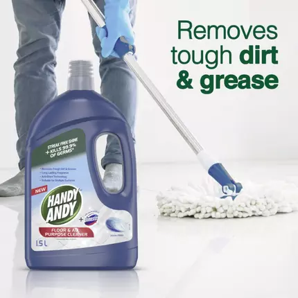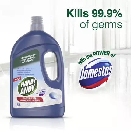 Handy Andy Ocean Fresh Floor and Multipurpose Cleaner gives your floors an impeccable shine and leaves them 99.9% germ free. Formulated with the disinfectant power of Domestos, this floor and multipurpose cleaner easily cuts though stubborn dirt and grease with no need to rinse. Suitable for multiple surfaces and provides your home with a fresh, long-lasting fragrance. You can enjoy a home that looks and smells great with Handy Andy's fresh, long-lasting fragrance. Handy Andy floor and multipurpose cleaner can be used on laminate flooring, tiles or polished concrete, so you can have shiny clean floors and surfaces in the kitchen, bathroom and all areas of your home. An effective floor and multipurpose cleaner that disinfects floors and other surfaces while adding shine. Handy Andy cleaning products, combined with the germ killing power of Domestos, leave your home germ free and smelling great. Handy Andy Ocean Fresh Floor and Multipurpose Cleaner contains acti-shine technology, suitable for multiple surfaces. Give your floors some TLC with this multipurpose floor cleaner. Floor and multipurpose cleaner that kills 99.9% of germs. Handy Andy floor and multipurpose cleaner bottles are made from 100% recycled material and are 100% recyclable.