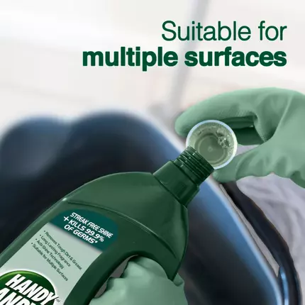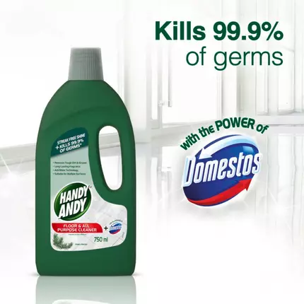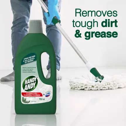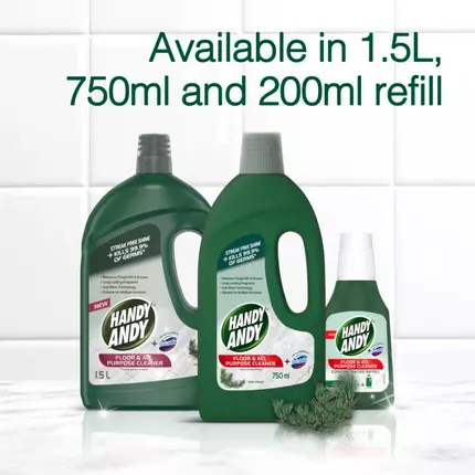 Handy Andy Pine Floor and Multipurpose Cleaner gives your floors an impeccable shine and leaves them 99.9% germ free. Formulated with the disinfectant power of Domestos, this floor and multipurpose cleaner easily cuts though stubborn dirt and grease with no need to rinse. Suitable for multiple surfaces and provides your home with a fresh, long-lasting fragrance. You can enjoy a home that looks and smells great with Handy Andy's fresh, long-lasting fragrance. Handy Andy floor and multipurpose cleaner can be used on laminate flooring, tiles or polished concrete, so you can have shiny clean floors and surfaces in the kitchen, bathroom and all areas of your home. An effective floor and multipurpose cleaner that disinfects floors and other surfaces while adding shine. Handy Andy cleaning products, combined with the germ killing power of Domestos, leave your home germ free and smelling great. Handy Andy Pine Floor and Multipurpose Cleaner contains acti-shine technology, suitable for multiple surfaces. Give your floors some TLC with this multipurpose floor cleaner. Floor and multipurpose cleaner that kills 99.9% of germs. Handy Andy floor and multipurpose cleaner bottles are made from 100% recycled material and are 100% recyclable.