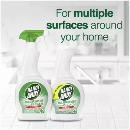 Handy Andy Ultrafast Multipurpose Antibacterial with Bleach Cleaning Spray cleans and disinfects quickly and easily.;Handy Andy Multipurpose household cleaner easily removes dirt and kills 99.9% of germs with a quick spray and wipe.;This multi-purpose cleaner degreases, disinfects and shines all in one easy clean.;There’s a Handy Andy Spray for every surface in your home, making cleaning quick and easy.;This multi purpose cleaner for every household surface has a fresh pine fragrance.;Handy Andy trigger spray makes cleaning a breeze in just 10 seconds.