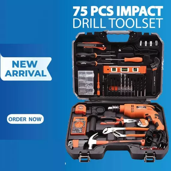 Specifications: 1Pc Mini Hacksaw: 300mm 1Pc Test Pencil: 145mm 2Pcs Screwdriver: (Slotted)6x100mm, (Philips)PH2x100mm 1Pc Bit Holder: 6x100mm 4Pcs HSS Drill: 4, 5, 6, 8mm 4Pcs Masonry Drill: 5, 6, 8, 10mm 4Pcs Wood Drill: 4, 5, 6, 8mm 1Pc Knife: 18mm 10Pcs Knife Blade: 18mm 4Pcs 1/4" Dr.Sockets: 8, 9, 10, 11mm 1Pc 1/4" Bit Adaptor 1Pc 1/4" Dr.Bit Holder: 61mm 1Pc Torpedo Level: 210mm 1Pc Working Accesories Box 1Pc Adjustable Wrench: 200mm 1Pc Digital Multimeter 22Pcs Bits Set 1Pc Combination Plier: 175mm 1Pc Water Pump Plier: 250mm 1Pc Claw Hammer: 8Oz 1Pc Measuring Tape: 3mx19mm 1Pc PVC Insulating Tape: 10m 7Pcs Hex Key: 1.5, 2, 2.5, 3, 4, 5, 6mm 1Pc Impact Drill: 230V/550W 0-3000rpm 1Pc Impact Drill Handle 1Pc Impact Drill Key 1pc Blow Case