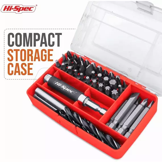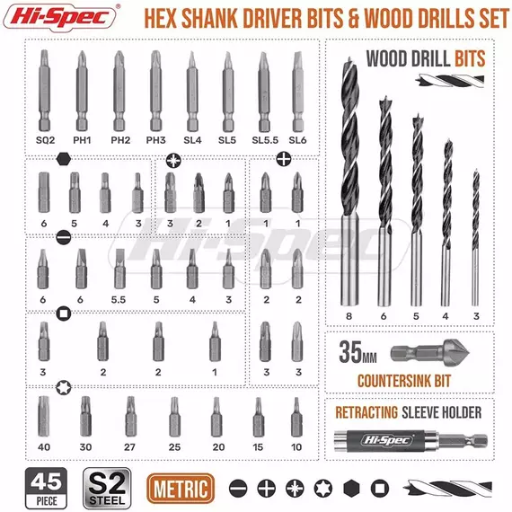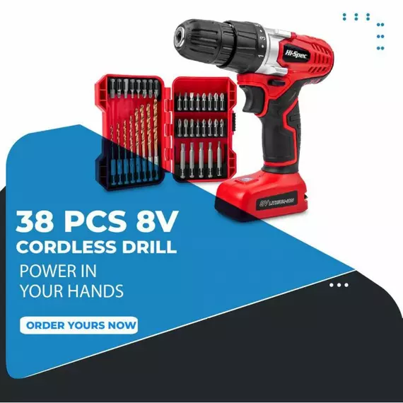 5-piece wood drill bits: 3-4-5-6-8 mm - carbon steel. 39 pieces of bits in a red case. - 30 pieces 25 mm bits: PH1, PH1, PH2, PH3, PH3, SL (3,4,5,5,5,6,6); PZ (#1, #2, #3), SQ (#1, #2, #3), HEX (3,4,5,6), Torx (T) 10,15. ,20,25,27), 30,40) - S2 - 8pcs 50 mm bits: PH (# 1, # 2, # 3); SL (4 SL5,5.5,6 mm); SQ (# 2) - S2. - 1 x flexible bit driver. 1 x 8 V cordless drill 1300 mAh Li-Ion - red and black. - Speed: 0-550 rpm / max. Torque: 10 Nm. - Bits: PH2; SL7/32 mm.