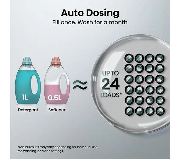 - Auto Dosing: Automatically selects the precise detergent or softener dosage per load. The large container stores enough for up to 24 loads (about one month).