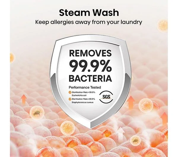 - Steam Wash: High-temperature steam penetrates fabrics to eliminate 99.9%* of Escherichia coli and Staphylococcus aureus, helping keep allergies away from your laundry.