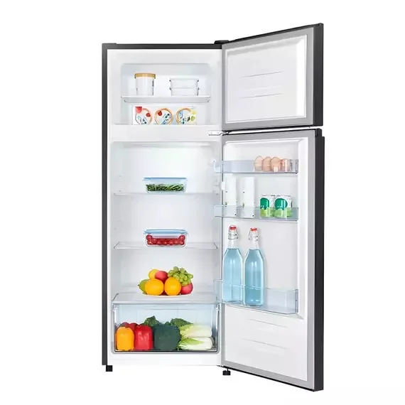 The Hisense RT1N205NEBN is a practical 205L double door refrigerator featuring a top freezer design. With an A+ energy efficiency rating, it offers ample cooling space in a compact, black cabinet ideal for small households or as an additional storage unit.