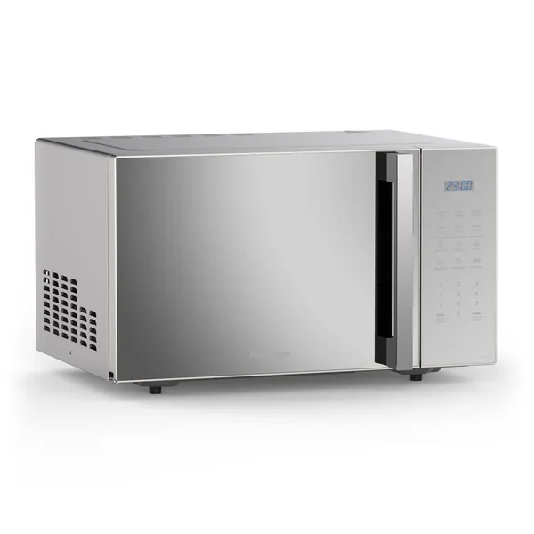 800W Microwave Power Output - Membrane Digital Control - Blue LED Display - Mirror Glass Door with Handle - Silver Housing - Grey Interior Cavity - 10 Microwave Power Levels - 6 Auto Cooking Menus - 99.99 min Cooking Timer - Digital Clock - 12/24 Hour C