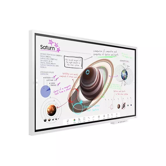 The Samsung Interactive Display WMB Series 65" is designed to enhance interactive collaboration in educational and business environments. With its fast and multi-touch capabilities, it offers a smooth and realistic drawing experience. The display supports up to 20 touch points, making it ideal for group activities and presentations. It features versatile connectivity options, including USB, HDMI, and DP, allowing easy access to content from various devices. The 3-in-1 USB-C port enhances connectivity by enabling screen mirroring, touch control, and device charging. Integrated with AirPlay 2, the display allows wireless sharing from multiple devices, ensuring no one misses out on important information. Full Specification Features Fast & Multi-Touch : Industry-best latency at just 26ms for a smooth drawing experience. Versatile Connectivity : Multiple options including USB, HDMI, DP, and 3-in-1 USB-C port. AirPlay 2 Integration : Wireless sharing from multiple devices for enhanced collaboration. SmartView+ : Connect up to 50 devices wirelessly and enable multi-view on up to four screens. Workspace : Access remote PC, network drive, and third-party applications like Office 365. Display Diagonal Size : 65" Panel Type : VA Resolution : 3,840 x 2,160 Pixel Pitch (HxV) : 0.372 x 0.372 (mm) Brightness (Typ) : 350 (w/o glass), 220 (w/glass) Contrast Ratio : 4000:1 (without glass) Viewing Angle (Horizontal/Vertical) : 178/178 Response Time : 8 ms Colour Gamut : 72>#/p### Glass Haze : 2% (without glass) H-Scanning Frequency : 30~81 kHz Maximum Pixel Frequency : 594 MHz V-Scanning Frequency : 48~75 kHz Operation Time Support : 16/7 Connectivity HDMI In : 2 DP In : 1 Version of HDMI : 2 Version of DP : 1.2 Version of HDCP : 2.2 USB : 1 (Rear), 3 (with optional front tray, Internal 1, External 1, USB-C 1) Audio Out : Stereo Mini Jack RS232 In : Yes RJ45 In : Yes WiFi : Yes Bluetooth : Yes Power Power Supply : AC100-240 V 50/60 Hz Power Consumption (On Mode) : 192.5 W Power Consumption (Sleep Mode) : 0.5 W Dimensions & Weight Set Dimension (WxHxD) : 1522.4 x 897.6 x 62.9 mm Package Dimension (WxHxD) : 1691 x 1055 x 198 mm Set Weight : 39.7 kg Package Weight : 48.2 kg Operation Conditions Temperature : 0℃~40℃ Humidity : 10 ~ 80%, non-condensing Mechanical Specification VESA Mount : 400 x 400 mm Bezel Width : 26.2 mm Frame Material : Plastic Optional Feature Touch : Yes Mount : Yes (Model Name: WMN-WM65R) SoC OS Version : Tizen 6.5 Flash Memory Size : 32 GB Touch Touch Technology : IR Certification and Compliance EMC : Class A FCC (USA) Part 15, Subpart B KCC/EK (Korea) Tuner: KN32 / KN35 Tunerless: KN32 / KN35 CE (Europe) EN55032: 2012 or 2015 EN55024:2010 or EN 55035:2017 VCCI (Japan) VCCI CISPR32:2016 CCC (China) GB/T9254-2008 GB17625.1-2012 BSMI (Taiwan) CNS13438 (ITE EMI) CNS14336-1 (ITE Safety) CNS15663 (RoHS) C-Tick (Australia) AS/NZS CISPR32:2015 GOST (Russia/CIS) ROCT CISPR 24-2013 ROCT CISPR 22:2005 Safety : CB (Europe): IEC60950-1/EN60950-1 CCC (China): GB4943.1-2011 PSB (Singapore): PSB+IEC60950-1 NOM (Mexico): NOM-001-SCFI-1993 IRAM (Argentina): IRAM+IEC60950-1 SASO (Saudi Arabia): SASO+IEC60950-1 BIS (India): IEC60950-1 / IS13252 NOM (Mexico): Tuner: NOM-001-SCFI-1993 Tunerless: NOM-019-SCFI-1998 KC (Korea): K 60950-1 EAC (Russia): EAC+IEC60950-1 INMETRO (Brazil): INMETRO+IEC60950-1 BSMI (Taiwan): BSMI+IEC60950-1 RCM (Australia): IEC60950-1/AS/NZS 60950-1 UL (USA): cUL60950