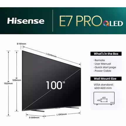 144Hz Game Mode Pro: Step up your game with the 144Hz Game Mode PRO, enhanced with an integrated game bar. Dive into ultra-fluid motions, thanks to precise variable refresh rates and low latency MEMC. At a lightning-fast 144Hz, it's not just about playing; it's about conquering every frame. Victory never looked this smooth. Quantum Dot Colour: With Quantum Dot Colour, it isn’t just about color; it's a revolution in display technology. Dive into an expansive spectrum where every hue is intensified, every gradient fine-tuned. From the deepest red rose to the subtlest blue sky, witness a world rendered with an authenticity that mirrors life itself. Dolby Vision Atmos: The fusion of Dolby VisionTM HDR imaging and Dolby Atmos sound transforms your TV into an entertainment powerhouse. Dolby Vision is cinema-inspired HDR technology that brings your TV to life with dramatic imaging — astonishing brightness, color, contrast, detail, and dimensionality. Dolby Atmos puts you inside the action with bigger, more encompassing sound that fills your room. Full Array Local Dimming: Embrace a viewing transformation with Hisense's Full Array Local Dimming technology. Harnessing a myriad of independent dimming zones distributed across the back panel, it provides meticulous control over each region. The result? Precision in brightness ensures each fleeting glow and enveloping shadow is presented with unparalleled clarity and depth. Built-in Subwoofer: Unleash the power of deep bass from within your TV with the Built-In Subwoofer. Without the need for external units, it delivers rumbling lows that punctuate every scene, whether it's the subtle beats of a song or the roaring action of a blockbuster, elevating your audio experience to newer height. Screen size: 100 Inches Brand: Hisense Display technology: 4K UHD Resolution: 4K Refresh rate: 144 Hz Special features: Game Mode