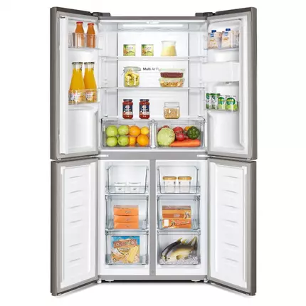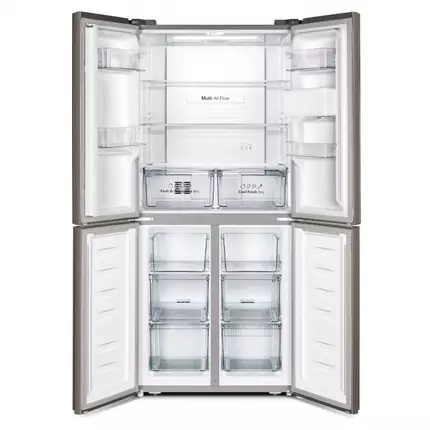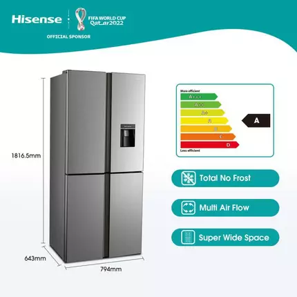 Features Bigger Drawers The big box compartment provides you with sufficient space to store large items while allowing you to make the best use of the available space. Convenient Storage Tailor the inside of the fridge to suit your needs by adjusting the heights between shelves. Door Balcony Safely store taller, bulkier items inside the door to accommodate milk or juice bottles and even two rows of drinks cans. Durable Inverter Powerful, more energy-efficient motor with less noise. Fresh Zone Effortlessly switch the My Fresh Choice zone from a fridge to a freezer, letting you tailor your Hisense H520FI-WD 392L Multi-Door Refrigerator to your latest weekly shop. With a temperature range of 5℃ to -20℃, create the perfect climate for your food & drinks and helps food stay fresher for longer, reducing food waste. Multi Air Flow Thanks to the even distribution of cold air achieved by the Multi-air Flow System, the optimal temperature is consistently maintained throughout your refrigerator. It helps keep your food chilled to perfection no matter where it is placed. Soft LED Highly efficient illumination enables a clearer view of the fridge content. Stylish Design Touch Control Control your fridge and freezer’s temperature with ease using the inbuilt digital control panel. Cooling Technology The back wall of the Hisense H520FI-WD 392L Multi-Door Refrigerator compartment is overlaid with stainless steel, which ensures even distribution of cool air from the inside out. This combination of advanced technologies always ensures ideal temperature levels while preventing the loss of cool air and frost build-up in the fridge. Feature Total No Frost Super Wide Space Water Dispenser LED Lighting Perfect for larger homes – the 4-door with water dispenser functionality will keep you organised while conserving energy Large 392L net capacity Smaller door opening, yet wider interior space 'A' energy efficient Side-by-side bottom freezer – energy saving Super Freeze and Super Cool functionality keeps your food fresh Easy-approach drawers Humidity-adjustable crisper will keep goods fresher and crisp Big guard for 2L bottles 3L water tank for large water storage LED cost-efficient lighting that's energy saving Specifications Product Type: Cross Door Color Finish: Brushed Stainless Steel Display: LED Net Capacity Total (L): 392 Refrigerator (L): 263(16L/Chill, Cool fresh box) Freezer (L): 129 Aesthetics Colours: Brushed Stainless Steel Handle (External / Integrated): Integrated General Features Max noise level: 42 Kind of coolant / Charge (R134a/R600a) / grammes: R600a/58 Temperature Control: A/A FRIDGE Energy efficiency class: A+ LED Light (Fridge/Freezer): Yes/yes Water Dispenser: Yes Refrigerator Compartment Fridge Shelves: 2/glass;1/plastic(Wine rack) Fridge door Storage rack: Right:2/light blue;left:2/light blue Eggs trays / Tray size: 2/12 holes eggs Crisper: 2 Freezer Compartment Freezer door racks: No Drawer: Right:2/draw+1/tray:left:2/draw+1/Tray Dimensions Dimensions