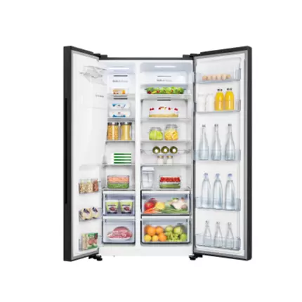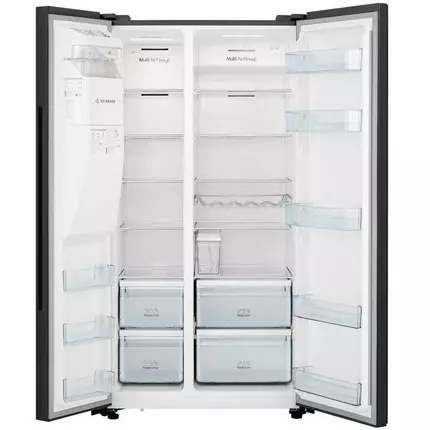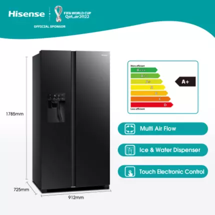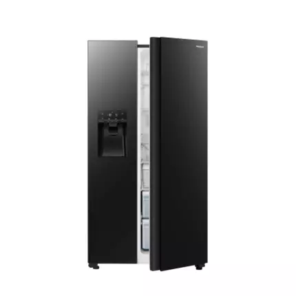 he Hisense 535L Black Glass Side by Side Fridge has an A+ energy rating, multi airflow cooling system and a tall ice and water dispenser. Thanks to the Super Cooling and Freezing, the temperature will be lowered for a short period of time to keep fresh shopping at the correct temperature. Premium black glass door design, this stunning fridge allows for more space with room to spare. With doors that close automatically, this beautiful design will be the perfect fit for any household and comes standard. Features: Independent Fridge and Freezer Zone Multi Air Flow Ice & Water Dispenser Touch Electronic Control Non-plumbed Water Tank Inverter Technology Technical Specifications: Net Capacity: 535L Net Capacity Fridge Compartment: 368L Net Capacity Freezer Compartment: 167L Climate Class: SN=10~32°C, N=16~32°C, ST=16~38°C, T=16~43°C Kind of Coolant / Charge (R134a/R600a) / Grammes: R600a/72g Freezer Compartment Star Rating: 4 Star (160L), 2 Star (7L) Freezing Capacity / 24 hours: 12kg / 24h Max Noise Level: 43 dB(A) Max Storage Time by Power Failure (Freezer): 8H Foaming Components (R141b / C-P): C-P Certifications (CE / ISO 9001/2 / LGA etc.): CE / CB Key Features: Defrosting Fridge / Freezer: Automatic / Automatic Control System: Electronic Frost Free (Fridge/Freezer): Yes Multi Airflow (Fridge/Freezer): Yes / Yes Huge Box: Yes Easy Cleaning Door Seal: Yes Crisper with Humidity Control Function: No Adjustable Spill-proof Shelves: No Tempered Glass: Yes LED Light (Fridge/Freezer): Fridge 2W LED / Freezer 2 + 1W LED Product Identification: Type / Appliance: Side by Side Refrigerator Free-standing: Yes Aesthetics: Door Profile: Flat Handle: Integrated Available Color: Black Glass Control Panel: External Control Display: Yes External Control Display with LED/LCD: LED Temperature Range (from > to): Fridge: 0℃≤tma≤4℃, Freezer: tf≤-18℃ Super Cooling (Fridge): Yes Super Freezing (Freezer): Yes Over Temperature Alarm (Red Lamp / LCD-LED / Acoustic): No Adjustable Thermostat: Yes Fridge Compartment: Shelves (Number / Type): 5 (4 shelves + 1 shelf on crisper) Color: Light blue (I36) Shelf (on Crisper): 1 Vegetable Compartment (Number / Color): 2 / Light blue Flexi-fresh Box: No Wine Rack (Number / Type): Yes / Metal My Fresh Choice (Call Chill Compartment Too): 0 Door Storage Rack(s) (Total): 5 / Light blue Door Covered Dairy Compartment: N/A Door Bottle Holder: N/A Protection Rod(s): 0 Reversible Door: No Freezer Compartment: Drawer(s): 2 Shelf(s): 5 (4 shelves + 1 shelf on crisper) Flap(s): No Door Storage Rack(s) (Total): 3 Color of Drawer: Transparent Accessories: Defrost Water Outlet: No Ice Cube Tray(s): Automatic – Ice & Water Dispenser Eggs Tray(s) / Total Number of Eggs: 1 Adjustable Feet (Front / Rear): 2 / 0 Castors (Front / Rear): 1 / 2 Wall Spacer Grid or Distance Holder: No Length of Cable / incl. Plug: 200cm Packing Dimensions & Loadability: Unit Dimensions without Handle (W / D / H): 910 x 686.5 x 1793 mm Packing Dimensions (W / D / H): 982 x 780 x 1877mm Depth with Open Door: 1142.5mm Power Supply: Voltage: 220-240V Frequency: 50Hz Energy Efficiency: Energy Efficiency Class: A+ Energy Consumption (EN153) per 24 h: 1.2 kWh / 24 h Energy Consumption / Year: 438 kWh / year Weight & Dimensions: Weight: 121 kg Dimensions: 98 × 78 × 188 cm