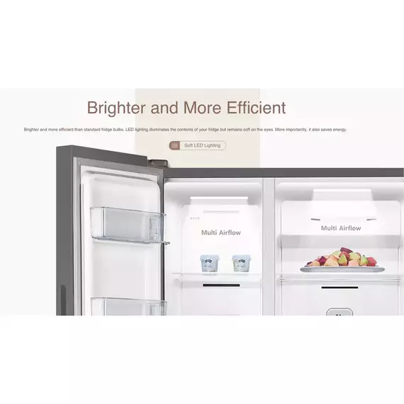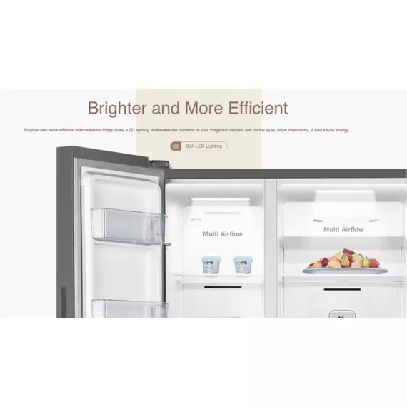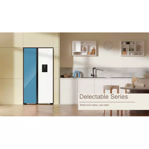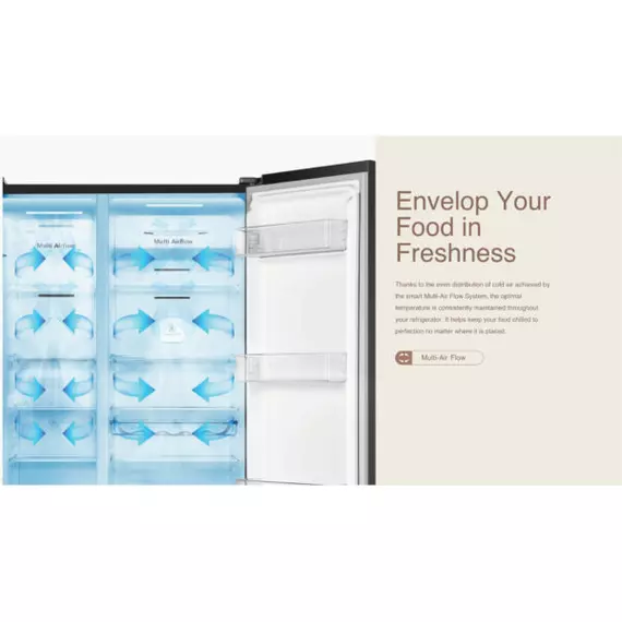 Hisense H670SDBL-WD | Delectable Range | Side By Side Refrigerator Finish: Blue & White Net capacity: 508L A+ energy efficiency class, energy saving Multi air flow system, no frost Fresh air filter Touch LED touch control Removable tempered glass shelves Multiple mode to suit different refrigeration needs, such as Super cooling, Super freezing, holiday, energy saving mode 2L Water Tank Door opening alarm Broad climate design (N,ST) Long life LED lights, saving energy Net Dimensions (W*D*H, mm): 910×646×1786 Container load (40’HQ): 48 Child Lock Function A Energy Rating Products with an A Energy Rating offer excellent energy efficiency, helping you save on electricity bills while reducing your carbon footprint. This rating ensures that you’re choosing a product that performs optimally with minimal energy consumption. Food Sensor The Food Sensor monitors the internal temperature of your dishes, ensuring that they are cooked to perfection. This feature takes the guesswork out of cooking, allowing you to achieve precise results, whether you're making a tender roast or delicate pastries. Multi-Air Flow Multi-Air Flow technology ensures even distribution of cool air throughout the fridge, maintaining a consistent temperature on every shelf. This feature keeps your food fresher for longer by eliminating warm spots.